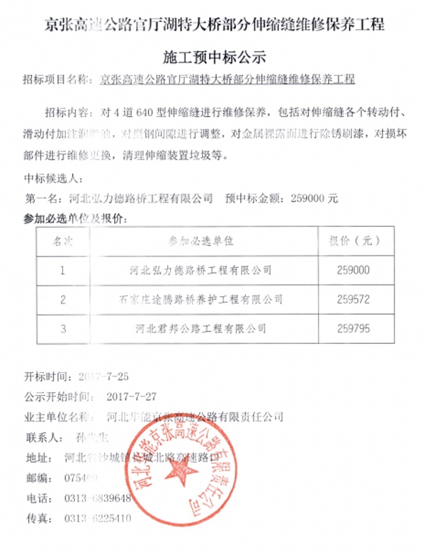京張高速公路官廳湖特大橋部分伸縮縫維修保養(yǎng)工程施工預(yù)中標公示